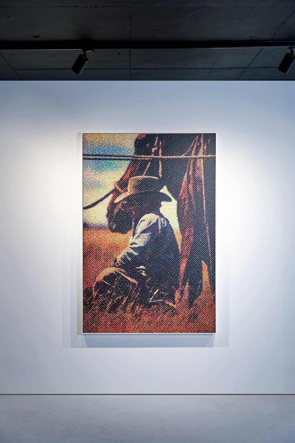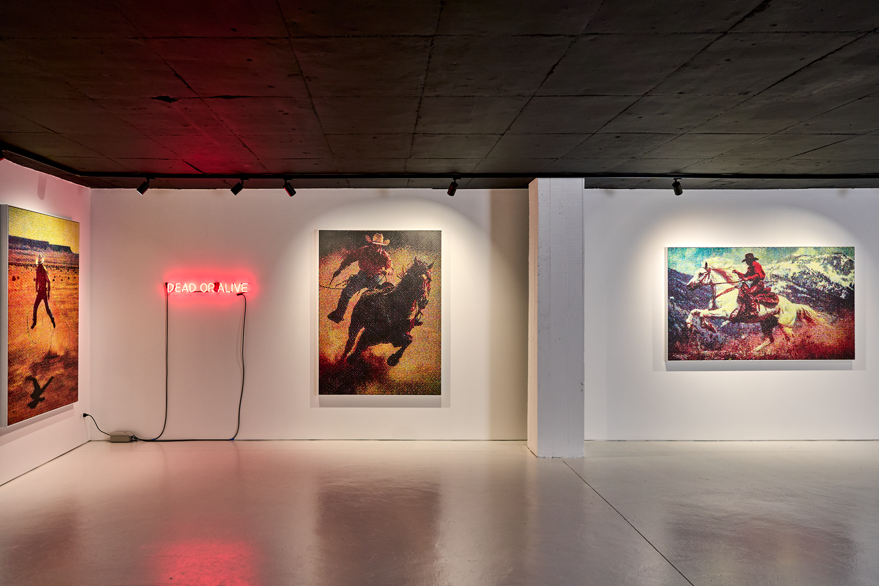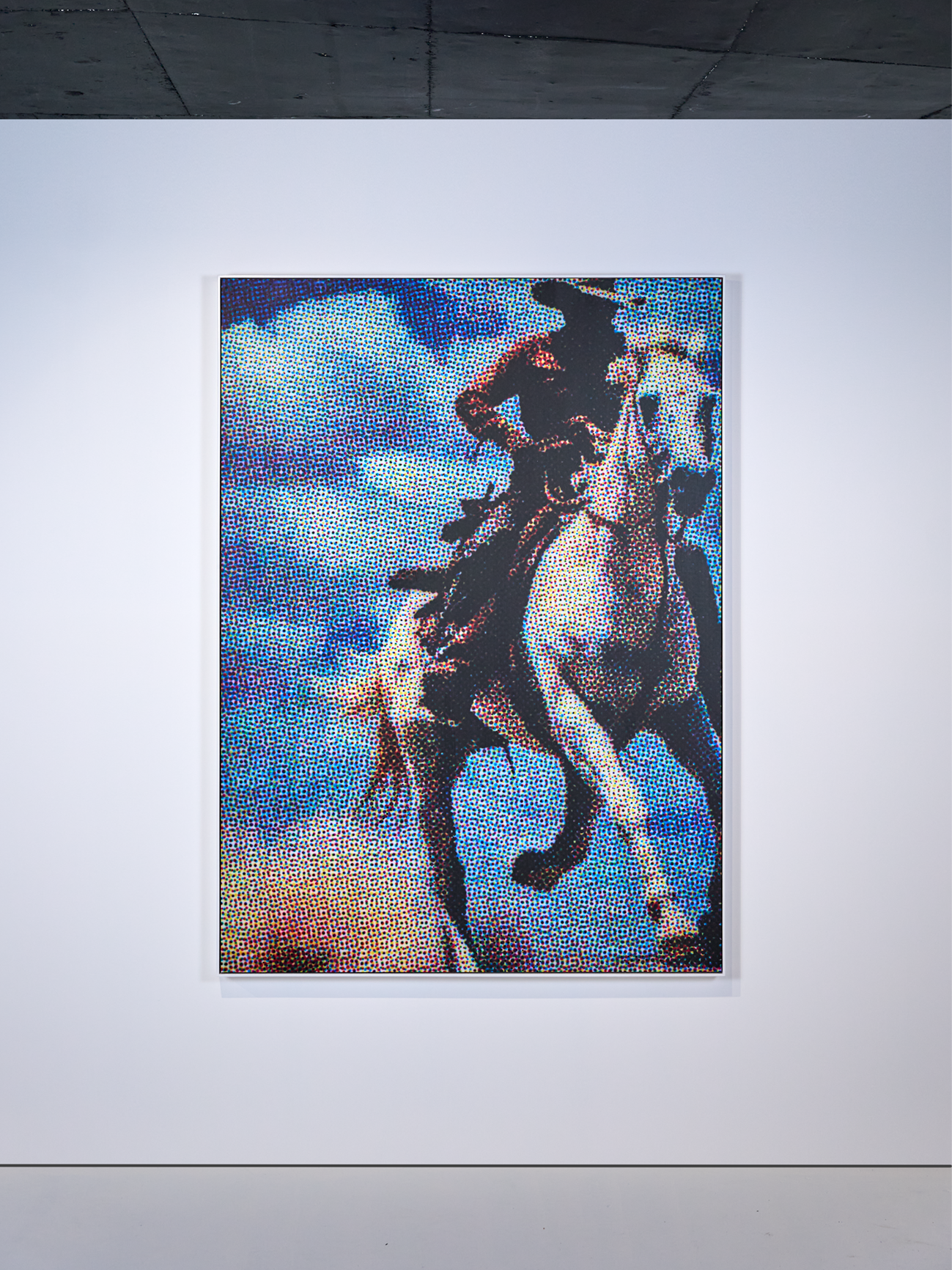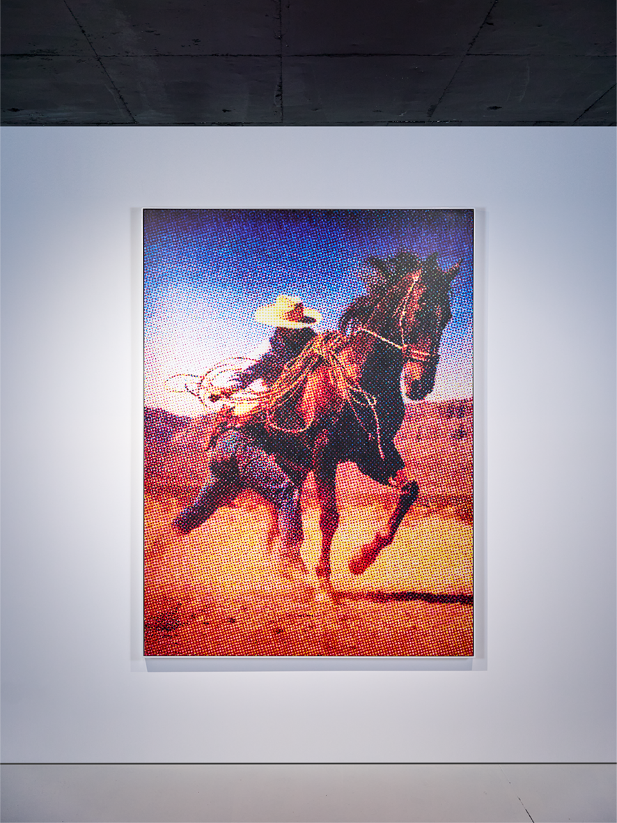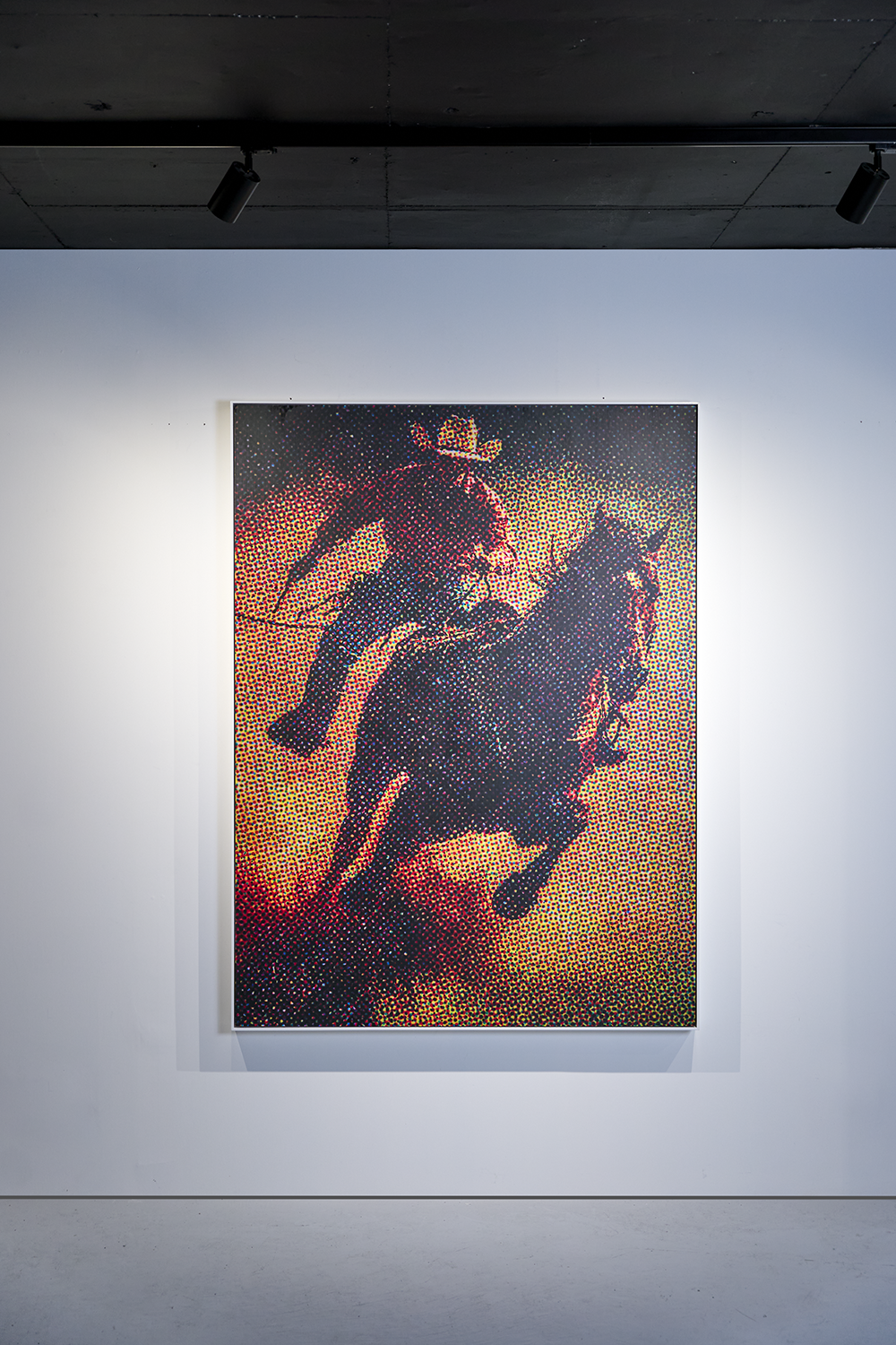 Working from AI-generated images of cowboys, Tom Adair renders these paintings with the dotted airbrush technique that features in much of his previous work. The regimented nature of these markings – that of equidistantly interspersed dots – mimics the technological language of the computer system (Midjourney) from which the source material originated, the aesthetic reminiscent of coding sequences or pixelated screens.