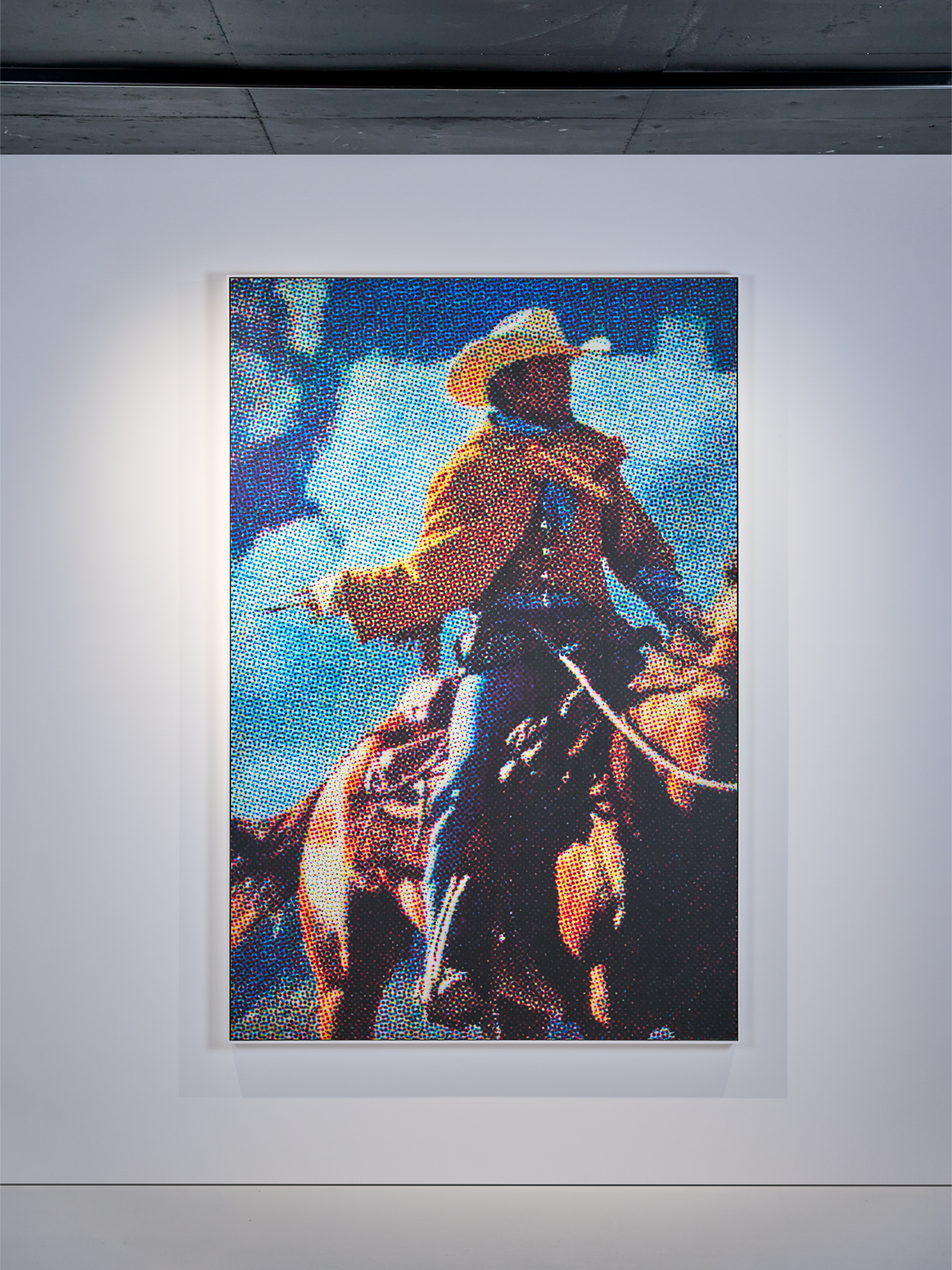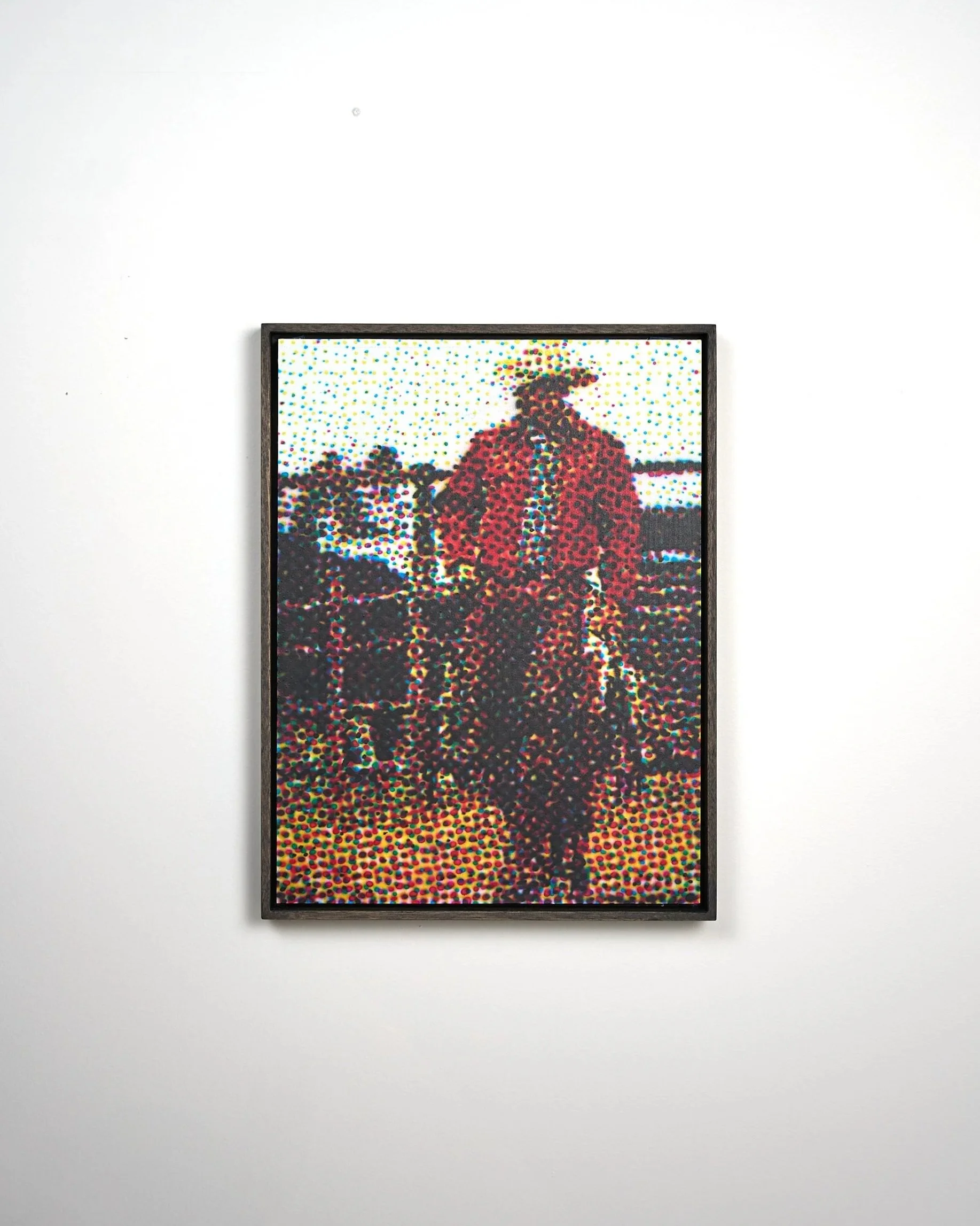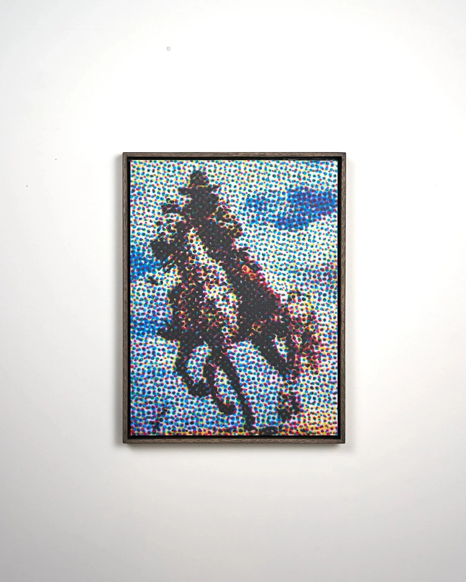For this exhibition, Adair acknowledges the influence of Richard Prince's Cowboys series, in which the American artist would “re-photograph” Marlboro cigarette ads, often cropping out the text and enlarging the image, recontextualising it as fine art. By using artificially generated imagery, however, Adair profoundly extends his predecessor's subversive approach to authorship, calling into question the very notion of originality and the role of human agency in the artistic process. Moreover, he further deconstructs the archetype of the cowboy, positioning him as the representative of analog humanity, rendered impotent in the face of Artificial Intelligence's manifest destiny. Oblivion, in which Adair depicts a cowboy riding away from, rather than into, a setting sun, is amongst the exhibition's most poignant expressions of this. Much like a captive, the rider sits in reverse and stares longingly at the horizon, the horse seemingly oblivious to his yearning. The ultimate effect of this contrast between the cowboy's desires and the implacable advance of his horse is a devastating sense of inevitability.